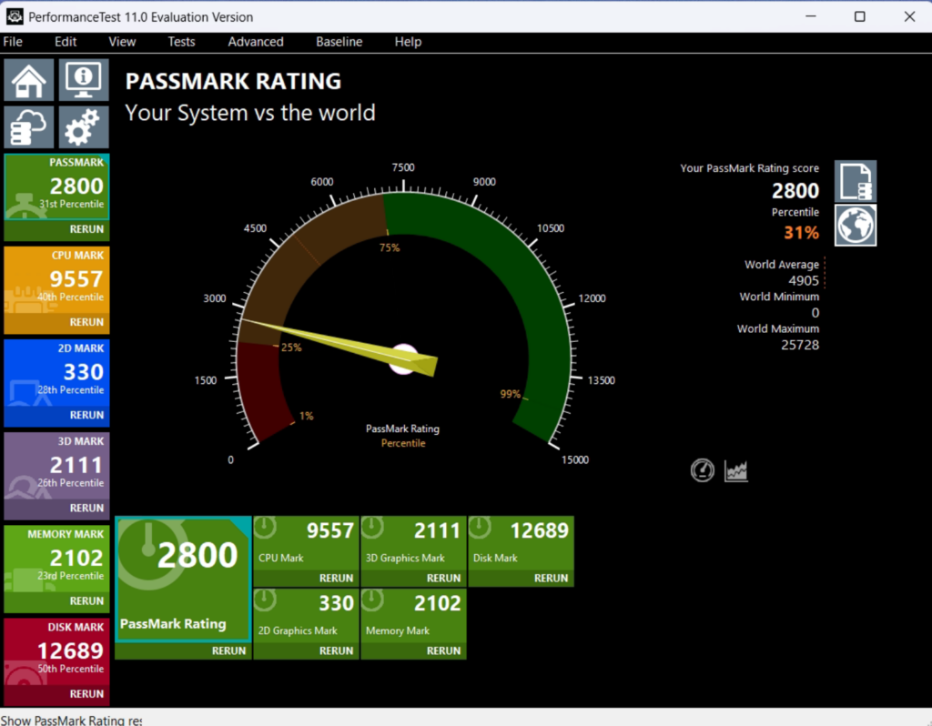 Zur Überprüfung der Systemleistung wurde mit dem „PerformanceTest“ eine Überprüfung mit nachfolgendem Ergebnis durchgeführt. Der Rechner ist nicht mehr der Schnellste. Es wurde keine Fehler in den gemessenen Komponenten festgestellt.